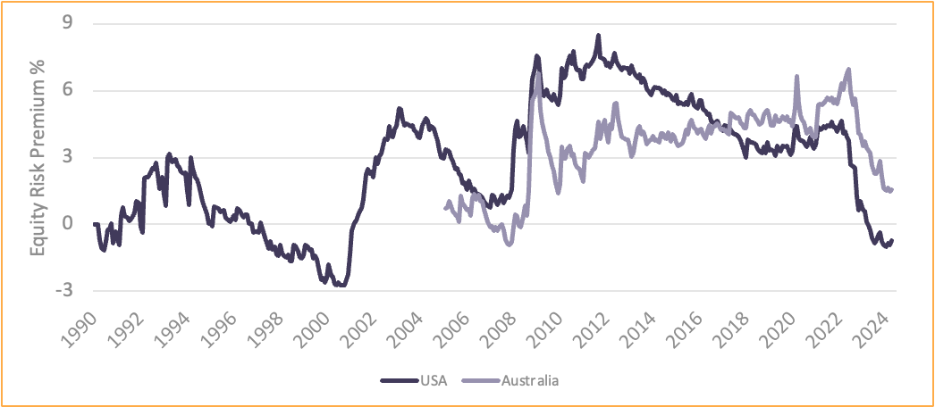One relative valuation measure combines the impact of higher interest rates and slowing earnings: equity risk premium (ERP) (see Figure 5). It shows the additional yield an investor achieves by investing in equities versus cash. In both Australia and the US equities are expensive, but this is most pronounced in US markets, where not only is the ERP at a multi-decade low, it’s negative!