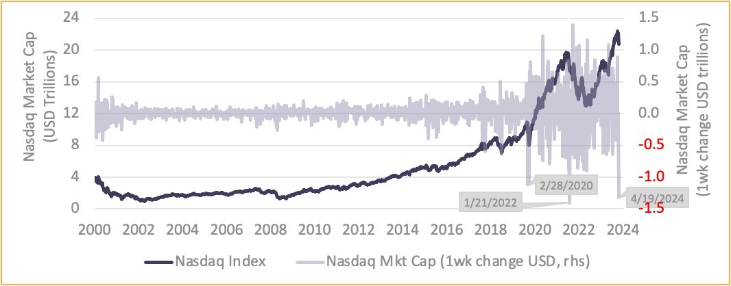 The sell-off was quite abrupt, smashing through 50-day moving averages and, in some cases, breaching 100-day moving averages. In the US, the tech-heavy Nasdaq index lost over USD 1.3 trillion in a single week, while in Australia the ASX 200’s sell-off reduced year-to-date price returns to barely positive.