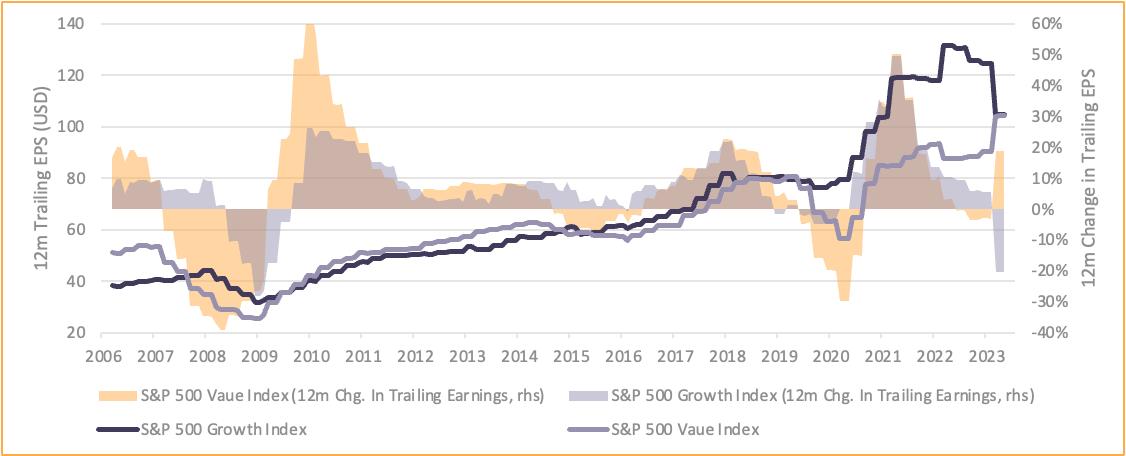 It’s clear that earnings per share (EPS) has rapidly converged, with both Growth and Value indices now delivering almost the same number. While that isn’t uncommon from a historical perspective, what is unusual is the 12-month change of the two earnings measures, which have moved in opposite directions: Value earnings have increased 19% while Growth earnings have fallen 20%.