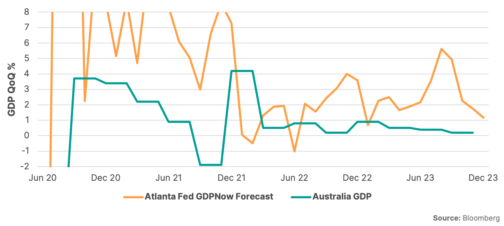 While markets sometimes appear to be operating in a parallel universe, back in the world of work GDP growth is slowing at home and abroad. The Atlanta Fed’s GDPNow forecast of Q4 growth is currently 1.2%, one of its lowest readings in the last year. At home, Australian Q3 GDP was +0.2%, well below expectations of +0.5%; and this number was primarily driven by the government spending on social benefits aimed at alleviating the consumer crisis of high prices. The Australian household savings-to-income ratio fell for the 8th straight quarter, to its lowest level since 2007: clearly not a sign of financial strength.