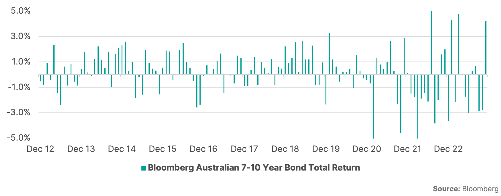 Government bonds also delivered uniformly strong returns during November, with the US 10-year yield falling 0.6%, eclipsed only by New Zealand’s 10-year bond yields, which dropped 0.67%. Australian government 10-year bonds fell 0.51% during the month, equating to a price return of 4.2%, the 4th strongest monthly return in the last decade. Interestingly the only three months with stronger returns were July ’22 (+5.15%), March ’23 (+4.78%) and January ’23 (+4.31%), all of which occurred during the much-debated worst bond bear market in history.
