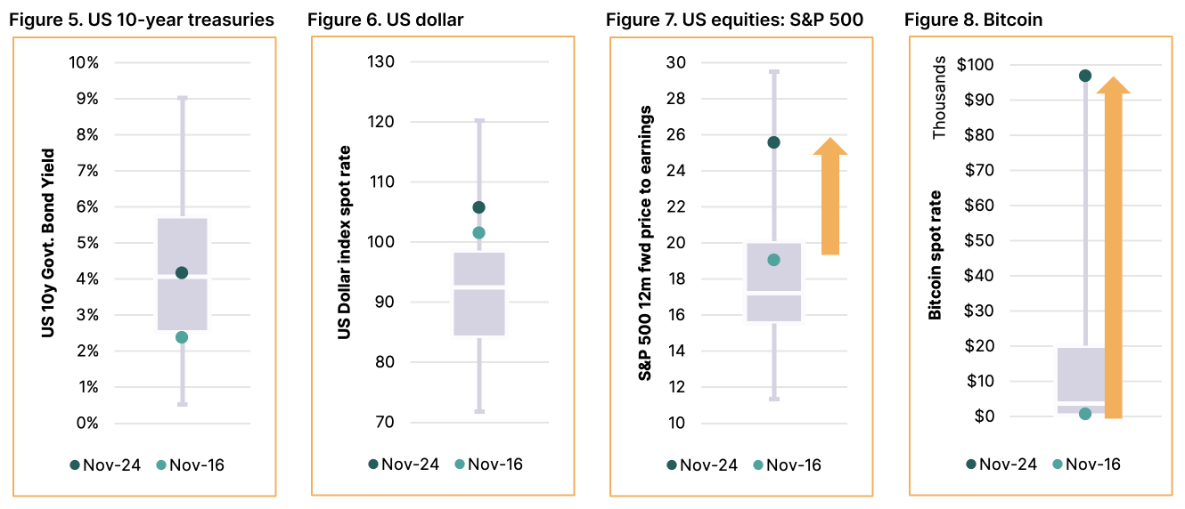 US equities: When Trump was elected in 2016, investors were paying 19 years’ worth of earnings in price. Today, investors are paying over 25 years’ worth of earnings for S&P 500 stocks, equating to the 96th percentile over the past three decades. The only times US stocks have been more expensive were prior to the bursting of the dotcom bubble and in the immediate aftermath of Covid when earnings expectations were still supressed.