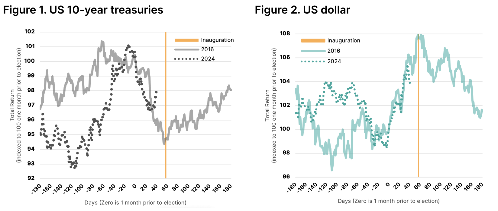 US equities: tracking in line with 2016, with potential for further gains in the months following inauguration;