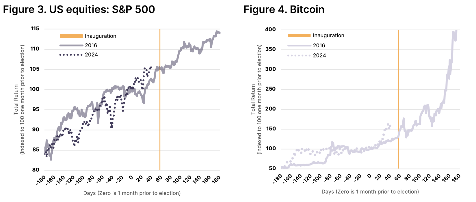 A single historical occurrence is not sufficient to establish an investment law, just as we should not take any politician's campaign promises as definitive policy. However, the charts above do suggest that, based on 2016, there is potential for further rallies in US shares and crypto, while the US dollar rally may be short-lived and US treasuries could face additional challenges.