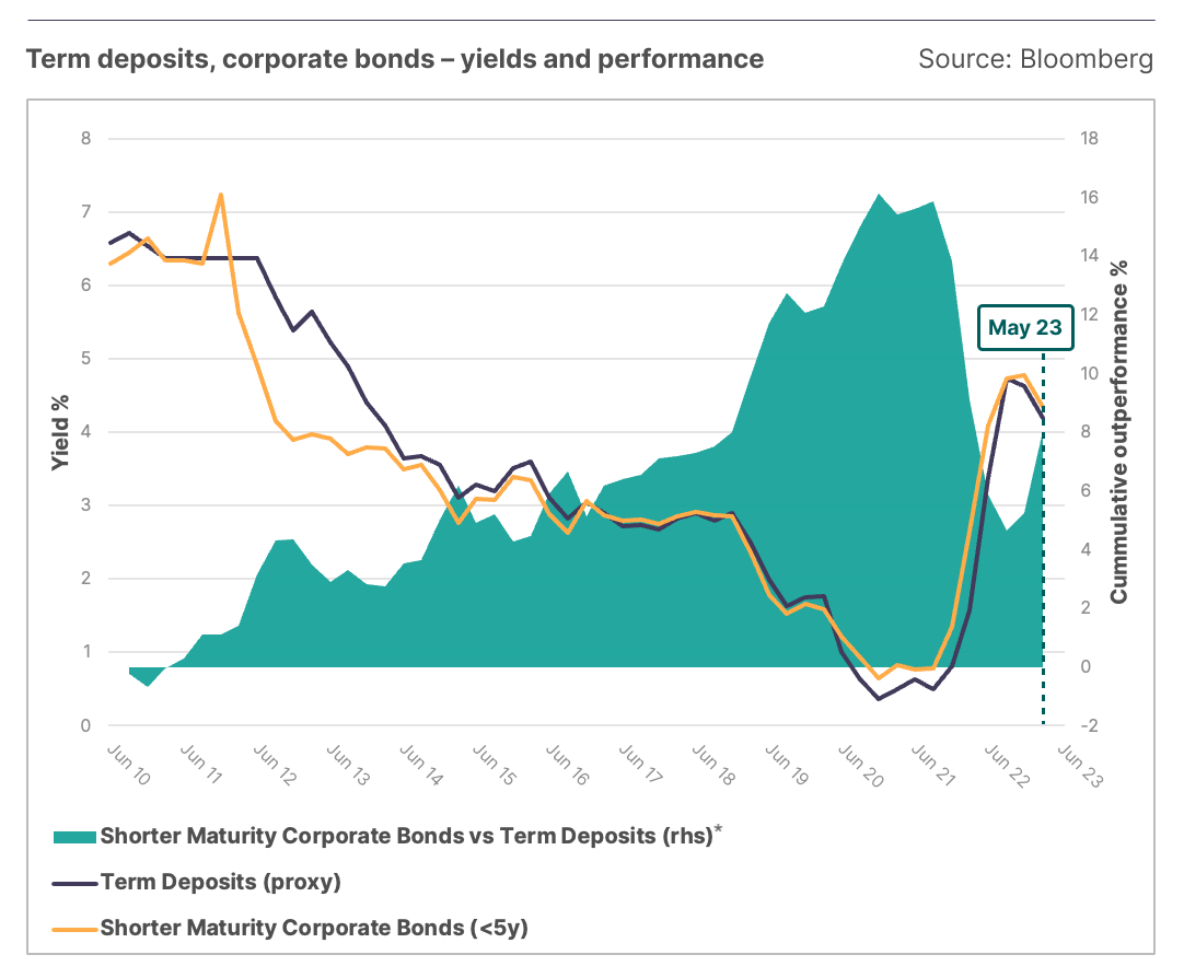 At this point, it’s worth comparing term deposits with another shorter-dated fixed income investment option, namely short-dated (under five years) investment grade corporate bonds.