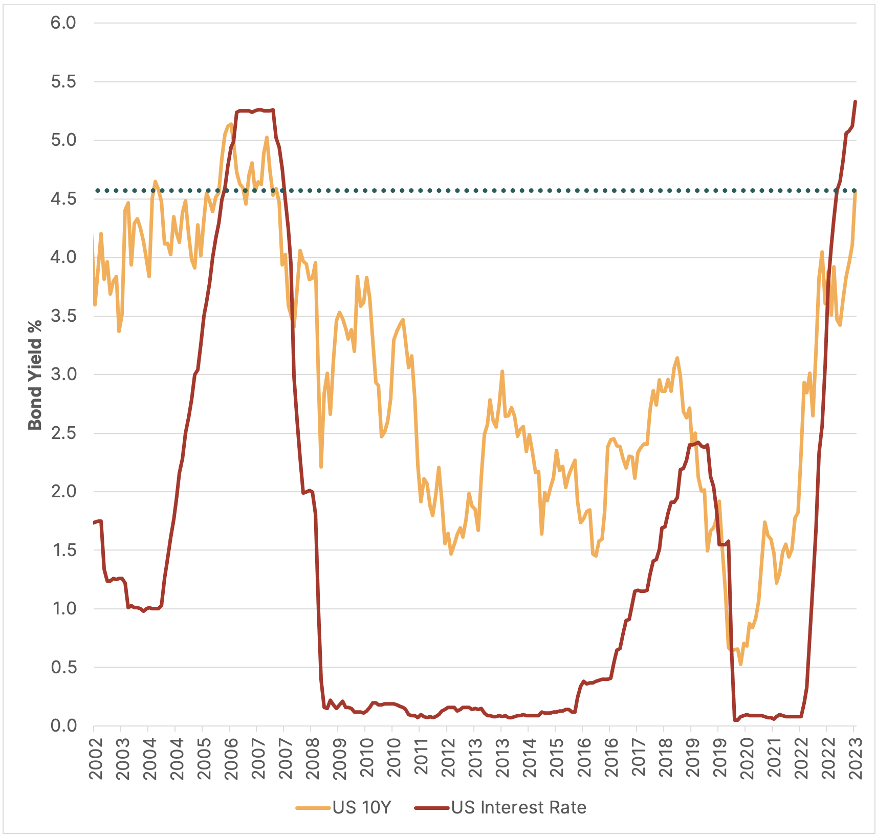 The same fears of “higher for longer” led fixed income markets lower during September, worsening Q3 losses across major government bond markets. Australian bonds fared a bit better since earlier in the quarter yields had not suffered as much as other international bond markets, thus limiting their Q3 selloff to the 46 basis points experienced in September (yields up = prices down). While continued bond market losses do create challenges in terms of shorter-term investment decisions, we do remain positive on the medium to longer-term outlook as the higher the yield, the more income protection we receive in future. The US 10-year government bond yield has now increased to levels not seen since before the GFC, climbing towards the higher end of their yield range experienced from 2003-08. This enables investors to receive a material ‘risk-free’ return. This in turn increases the hurdle required to invest in riskier assets like equities.