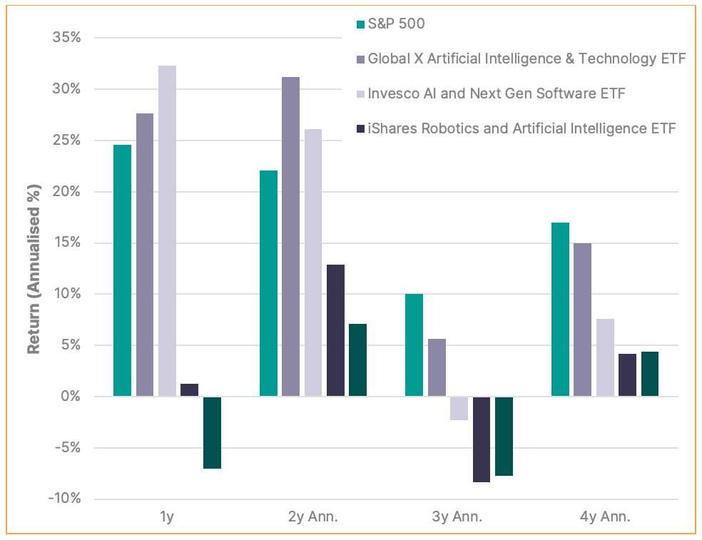 Figure 1. Select artificial intelligence ETF performance vs S&P 500